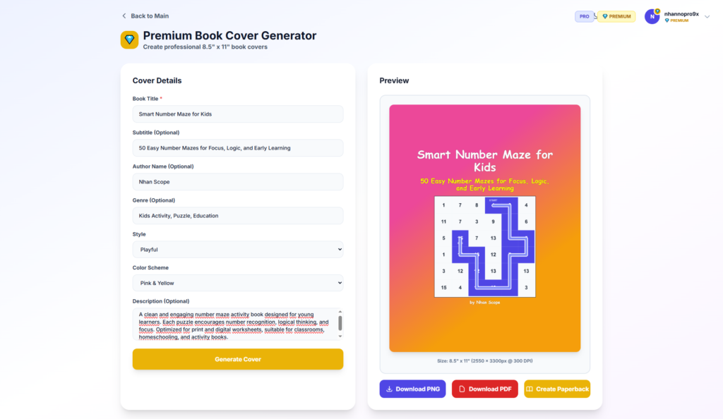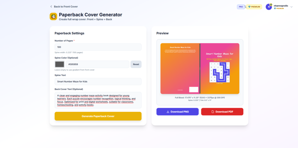 PREMIUM enables full professional book cover generation, including front cover design aligned with print standards. The system generates covers based on structured inputs (title, subtitle, genre, style, color scheme) without requiring external design tools.