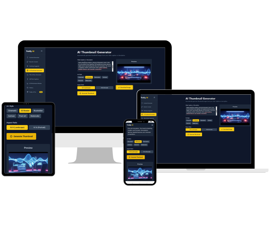 Trakly AI PLR White-Label provides a functioning Micro SaaS with AI content modules, thumbnails, rewriting, hashtags, A/B captions, and analytics review.